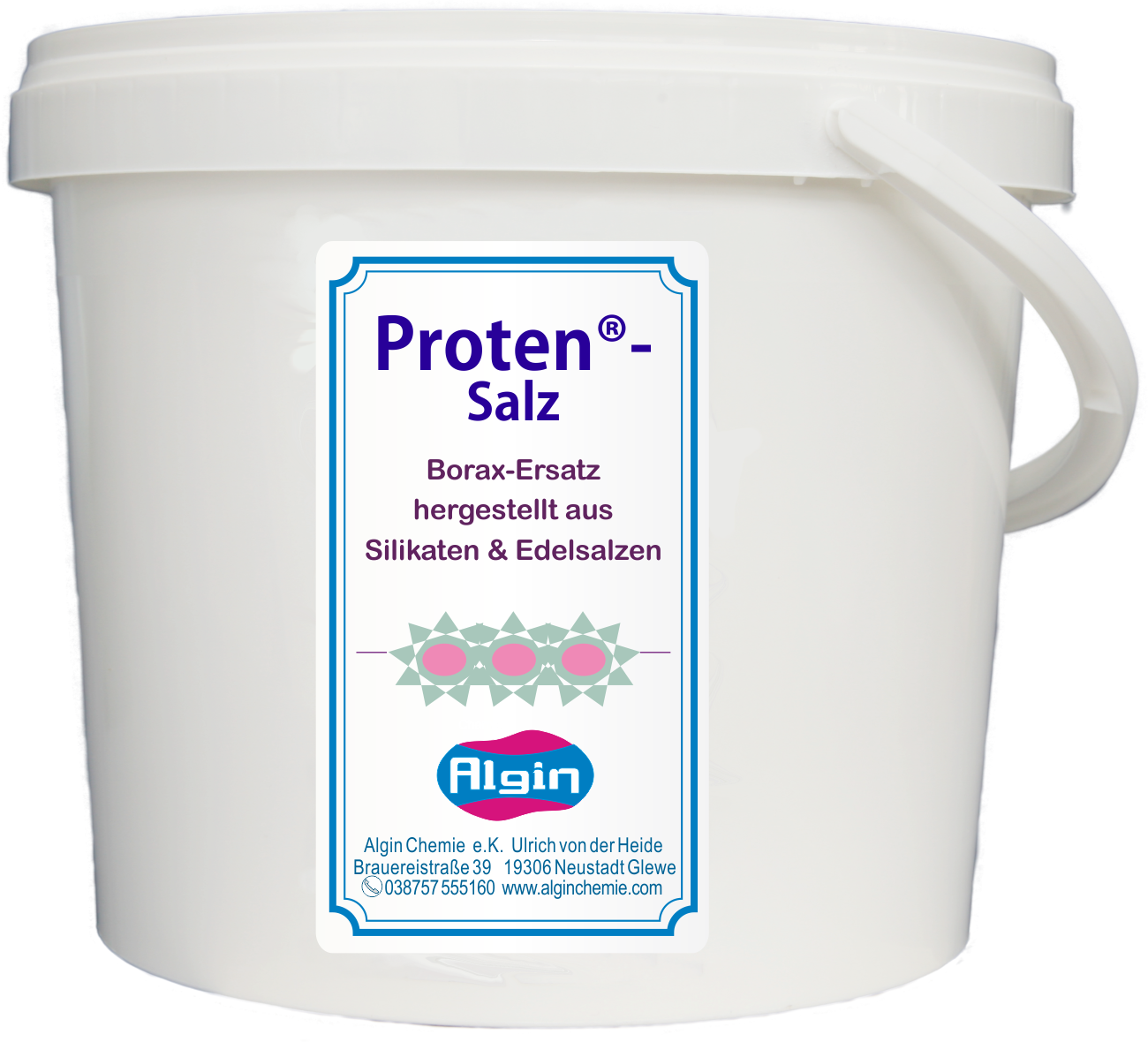 Verwendungshinweise: Reinigungsmittel im Haushalt und Gewerbe als Sanitärreiniger, Scheuerpulver, Wäscheweiß, Fleckenlöser, Teppichreiniger, unverträglich für viele Insekten, Schimmel und Algen. Befreit Wäsche von Flecken, macht sie weich und geschmeidig, ohne dass Weichspüler verwendet werden muss, auch verblasste Farben werden wieder aufgefrischt. Proténsalz ist mild alkalisch und wirkt deshalb zuverlässig antibakteriell, es hält Insekten fern und ist ein "ökologisches" Holzschutzmittel für den Innenbereich, außen wenn nach dem Trocknen mit Algin-Rontec-Produkten nachgearbeitet wird.
